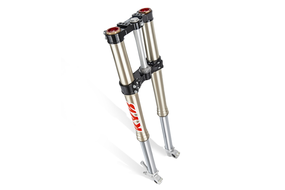 - ø 48 mm Kayaba AOS close cartridge fork: anodised internal parts and the treatments administered to the materials minimise sliding friction, while adjustable compression and rebound damping let each rider find the perfect customisation of the setting.